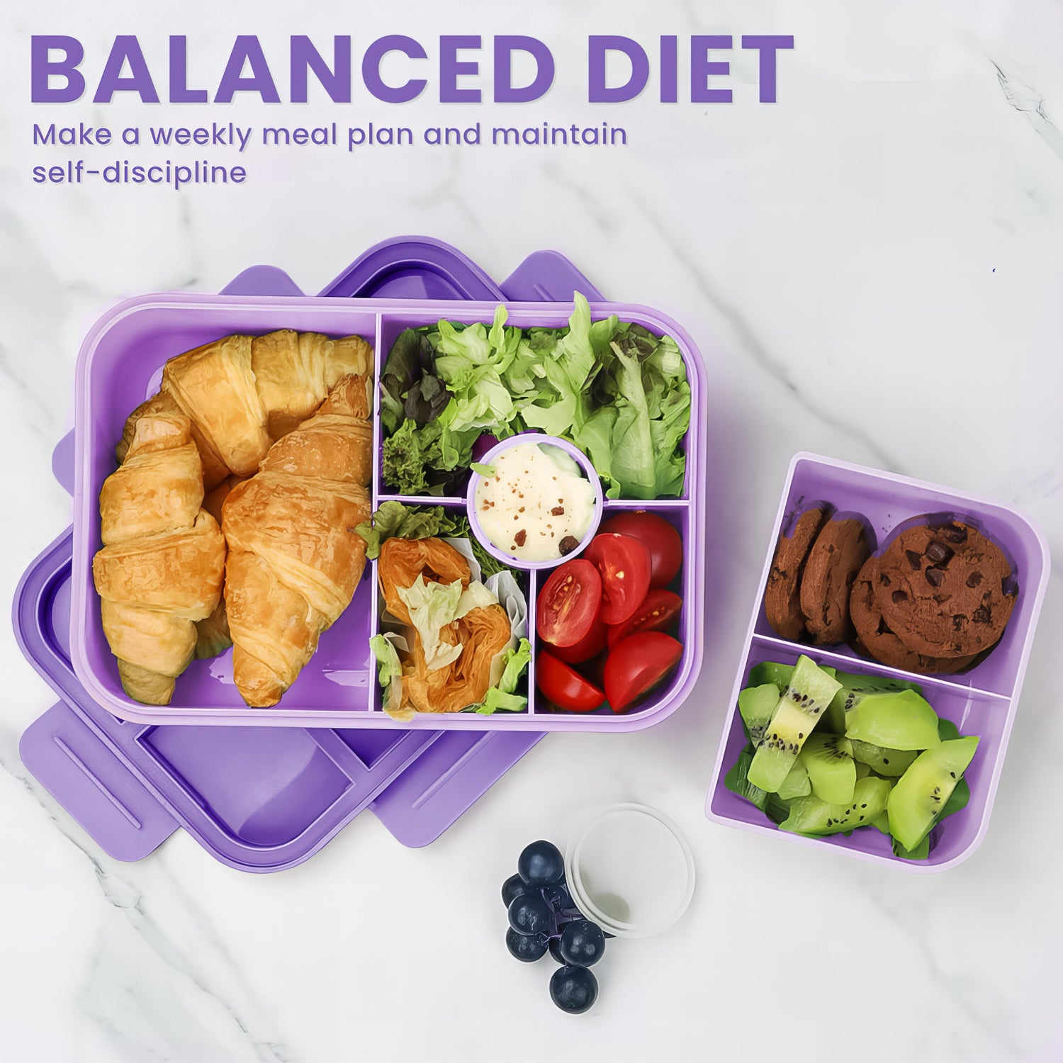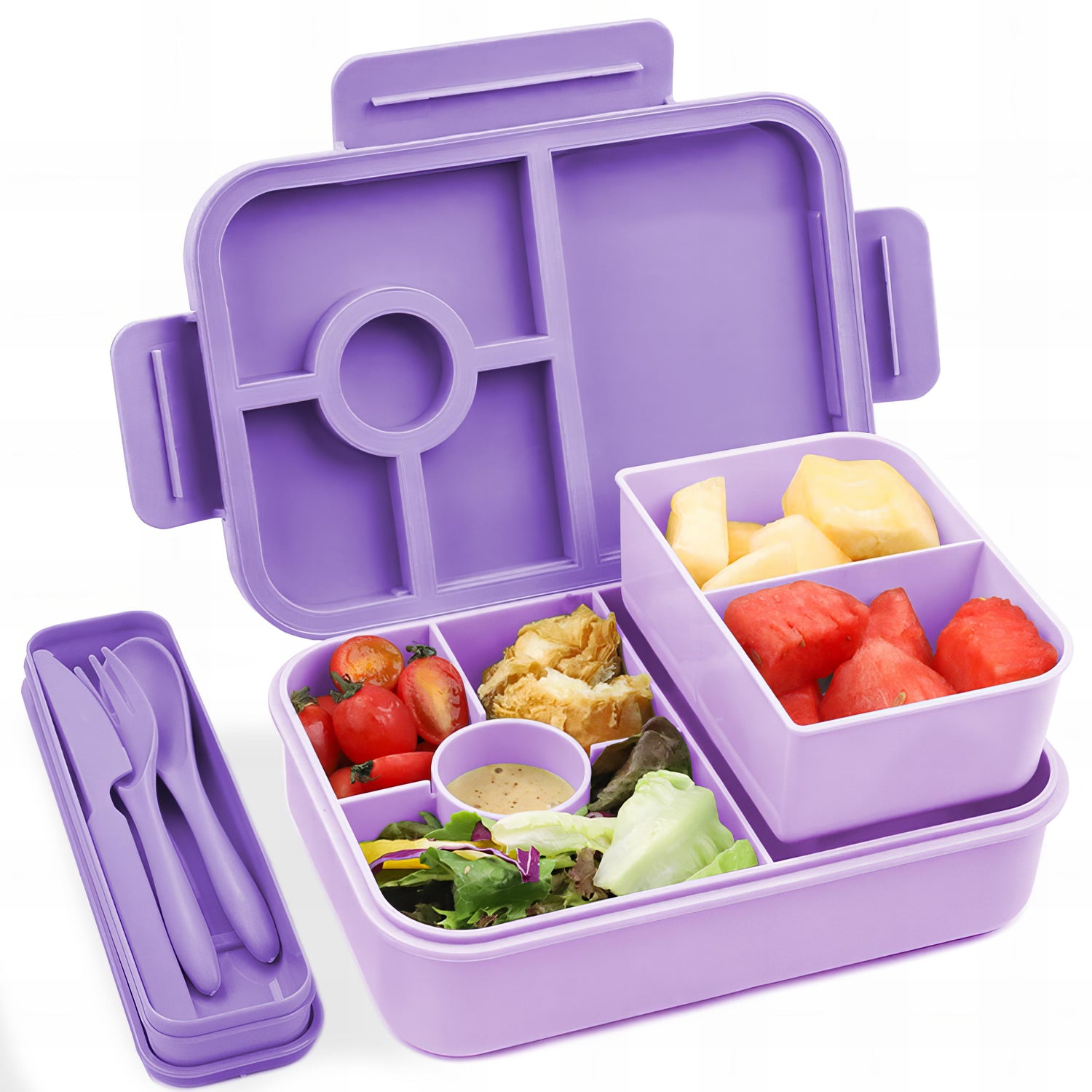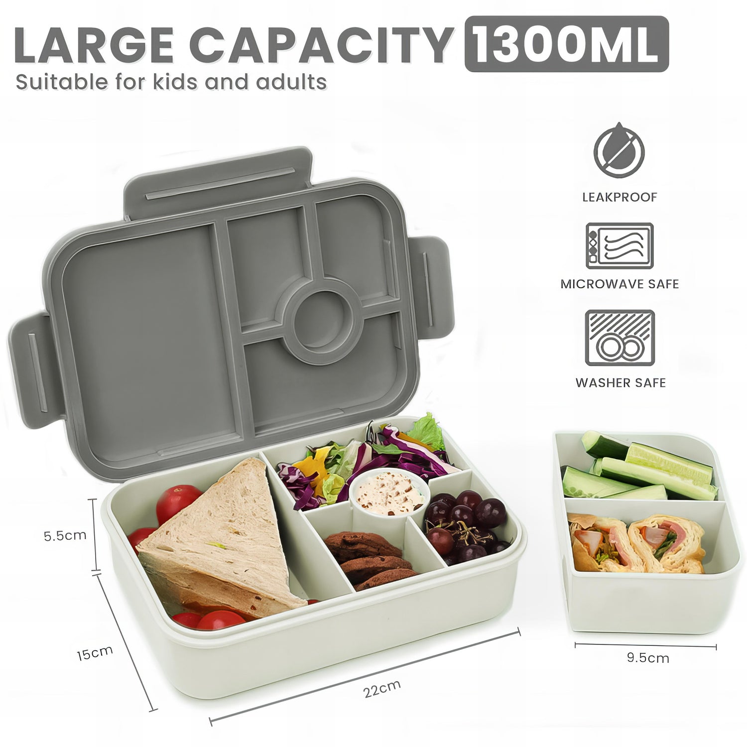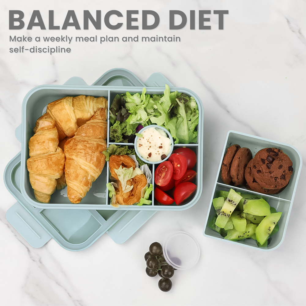 【PERFECT MATCH】The Bento Box has a capacity of 1300ML and consists of 5 fixed independent compartments and 1 detachable small box. The round compartment has a lid to prevent sauce from leaking. The large compartment can hold an entire burger or sandwich. The detachable small box has 2 compartments, which can store fruits, cucumber sticks, and carrot sticks to meet your diet.