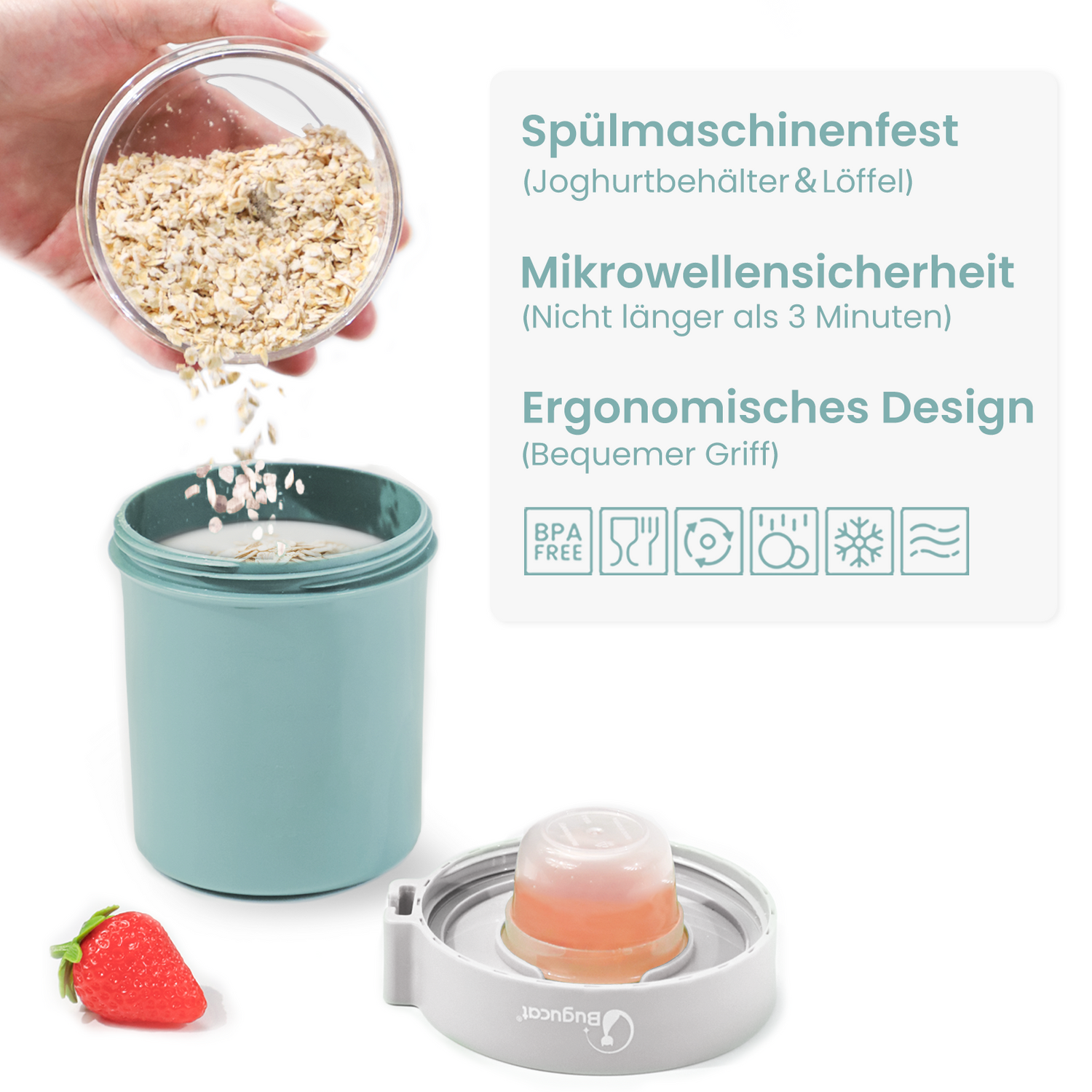 - Safe material: the Bugucat cereal cup to go is made of food-safe PP material, which is lead-free, non-toxic and odourless. It contains no bisphenol A and is robust and durable. The cereal to go cup is reusable, easy to disassemble and use as well as easy to clean (do not use hard or sharp cleaning tools).