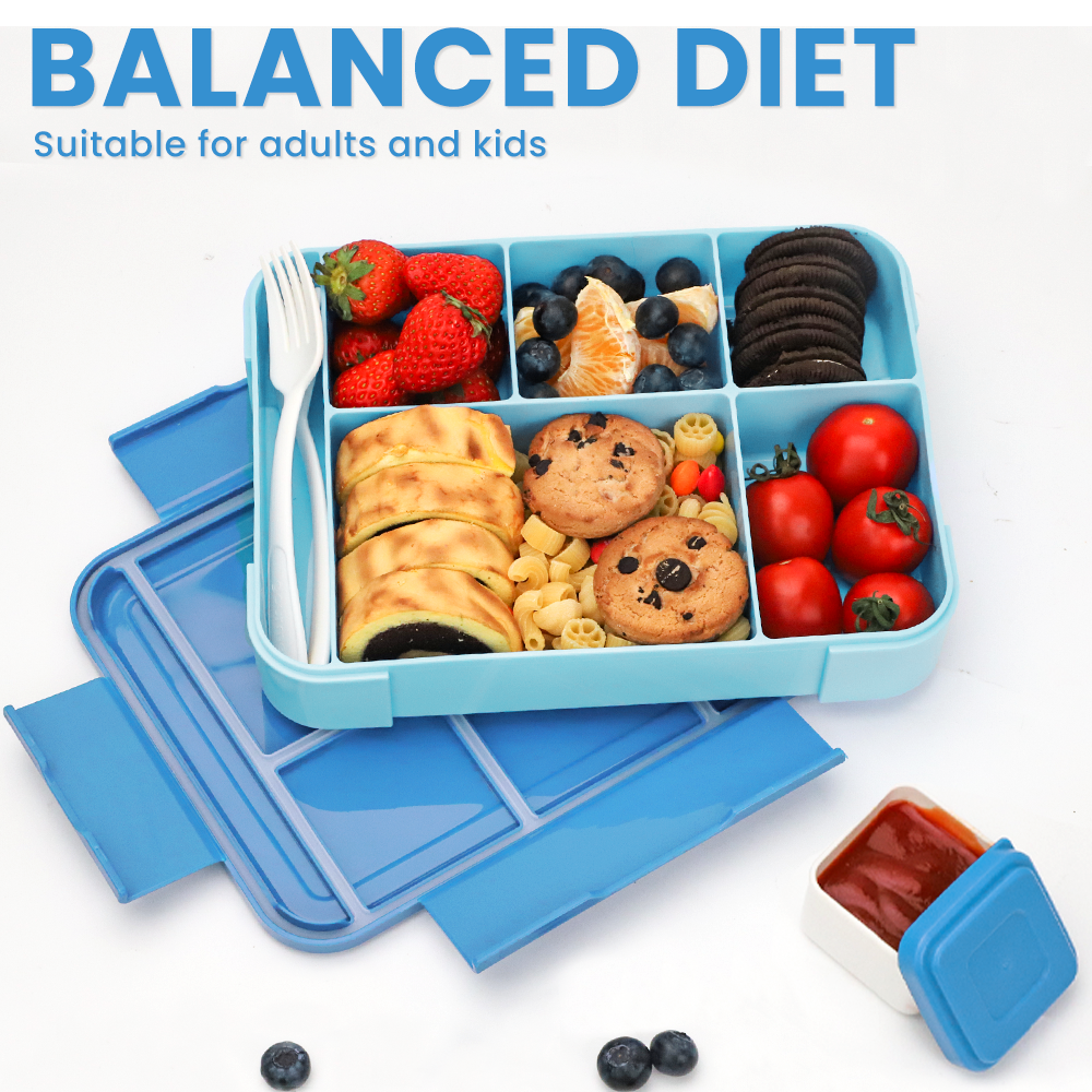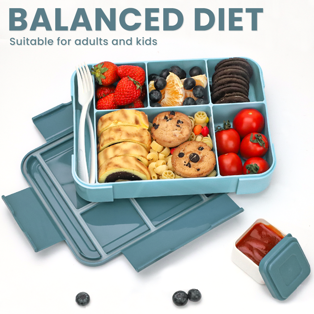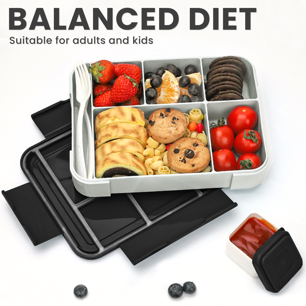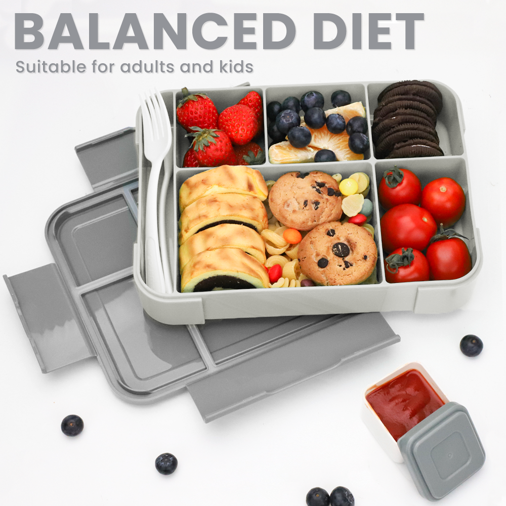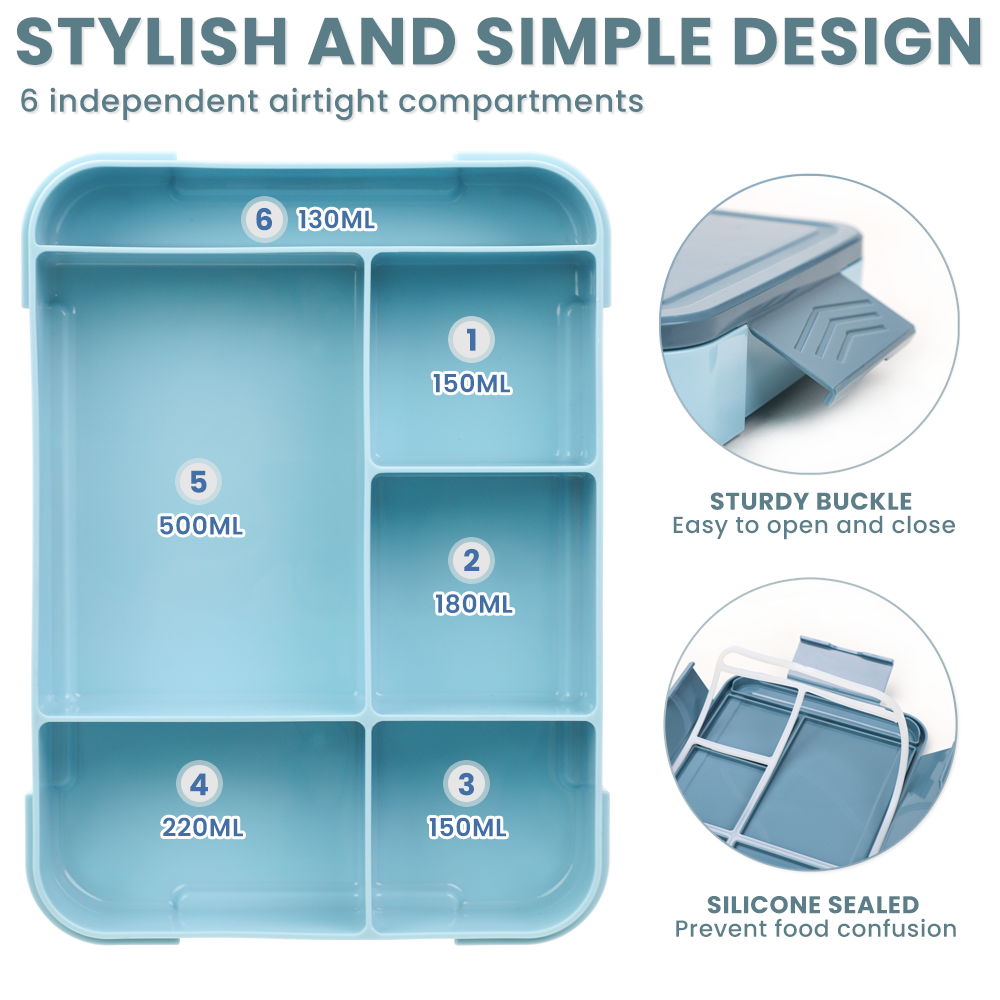 • 【CLASSIC DESIGN】 The tray of the Lunch box is composed of 6 fixed compartments, and the inside of the lid is sealed with a silicone ring, which perfectly wraps each compartment, which can effectively prevent food from leaking, avoid mixing and cross-contamination of different foods, and ensure the original taste of the food. 4 secure buttons on the sides keep the overall look simple.