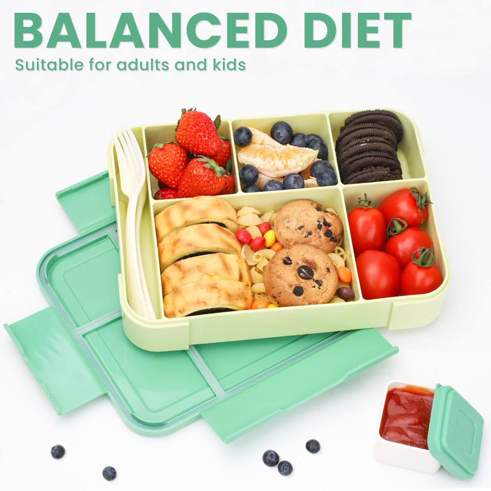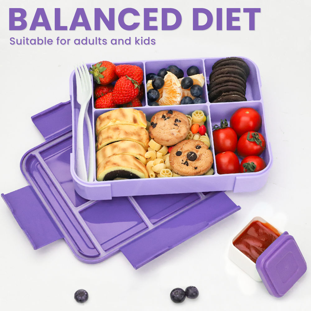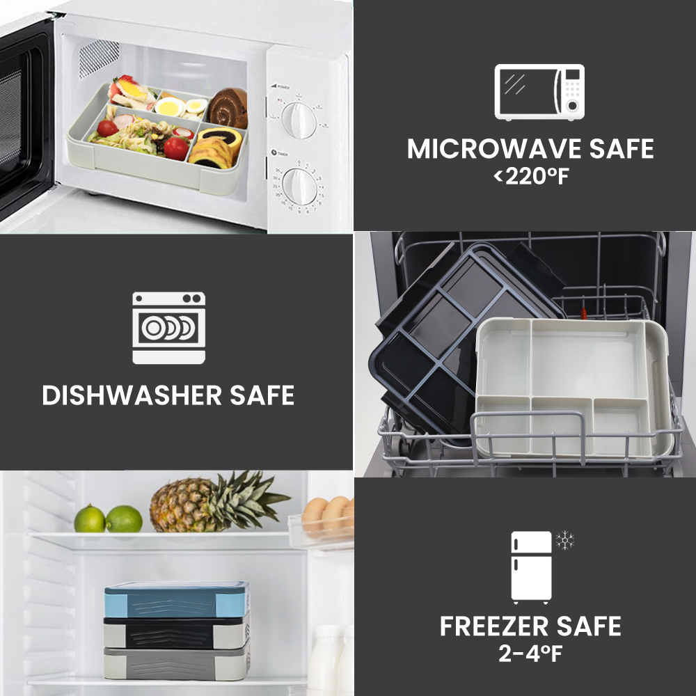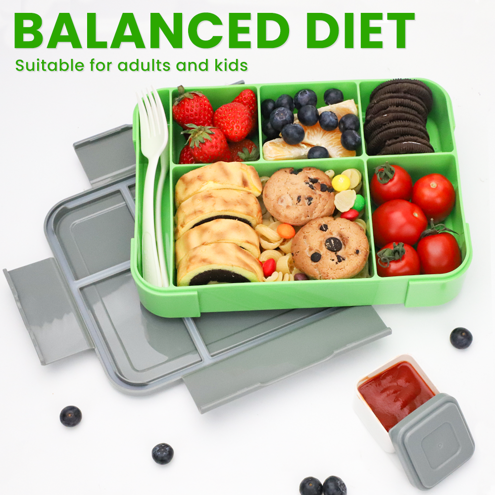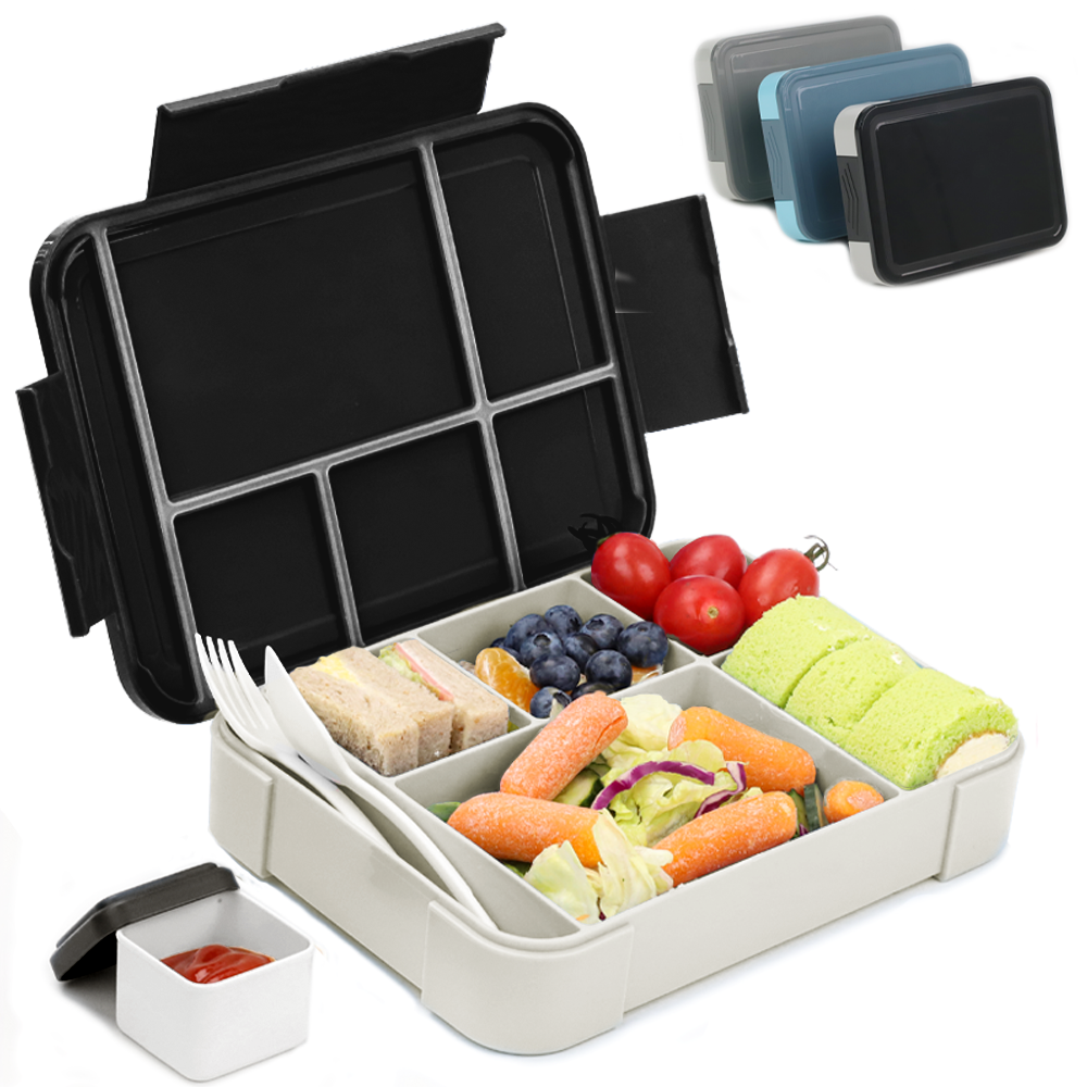 • 【CLASSIC DESIGN】 The tray of the Lunch box is composed of 6 fixed compartments, and the inside of the lid is sealed with a silicone ring, which perfectly wraps each compartment, which can effectively prevent food from leaking, avoid mixing and cross-contamination of different foods, and ensure the original taste of the food. 4 secure buttons on the sides keep the overall look simple.